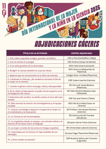 Durante el mes de febrero de 2026 la UEx ofrece un completo programa de talleres y charlas divulgación con el objetivo de visibilizar el papel de las mujeres en la investigación en el marco de la conmemoración del 11 de febrero, Día Internacional de la Mujer y la Niña en la Ciencia. El objetivo es visibilizar el papel de las mujeres en la investigación y despertar vocaciones científicas desde edades tempranas. El Servicio de Difusión de la Cultura Científica promueve este programa, que consta de 32 actividades a desarrollar durante el mes de febrero con dos modalidades: a) Actividades a desarrollar en los centros educativos; b) Actividades a desarrollar en instalaciones de la UEx.